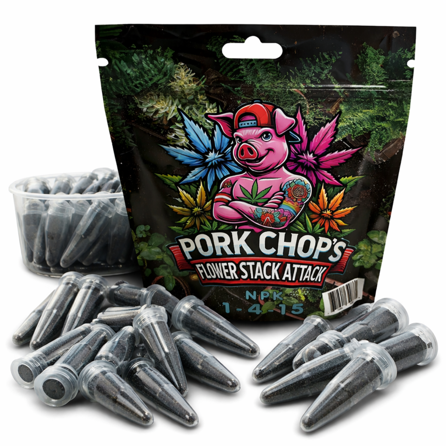 Pork Chop’s Flower Stack is a specialty bloom fertilizer formulated to support flowering plants during their most critical growth stage. Made with 100% all-natural ingredients, Flower Stack delivers targeted bloom nutrition without overfeeding, excess additives, or complicated mixing.