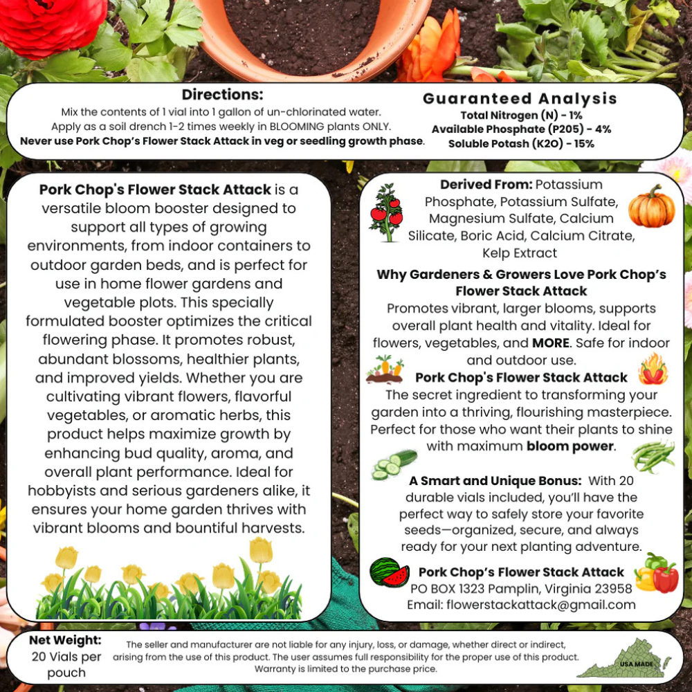 Pork Chop’s Flower Stack Attack is a Virginia-registered Specialty Fertilizer built for retail resale, grow shops, farm markets, and in-person vendors who want fast-moving inventory without using shelf space.
